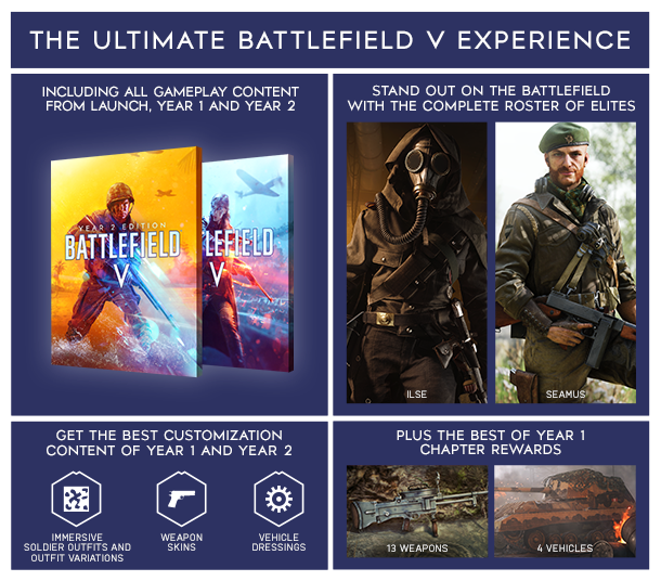Это максимальный опыт Battlefield V. Вступайте в величайший конфликт в истории человечества с полным арсеналом оружия, техники и гаджетов, а также лучшим контентом для персонализации из Year 1 и Year 2.