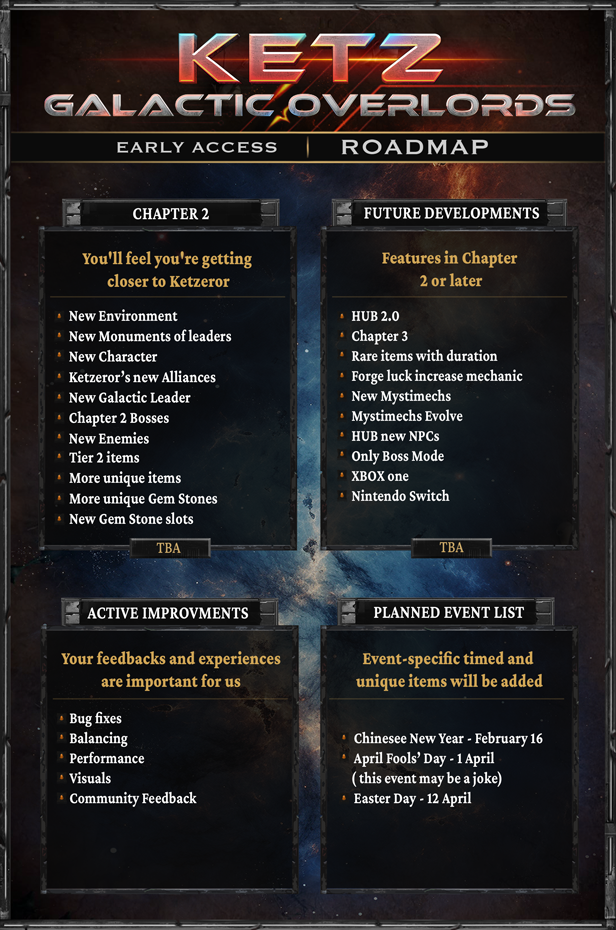 "Ketz: Galactic Overlords — экшен-рогалайт с иной тематикой, историей и механиками по сравнению с аналогами. Нам нужна ваша поддержка в версии раннего доступа, чтобы выпустить Ketz и устойчивые проекты этой вселенной, которую мы активно развиваем командой из 9 человек и намерены придерживаться плана разработки."